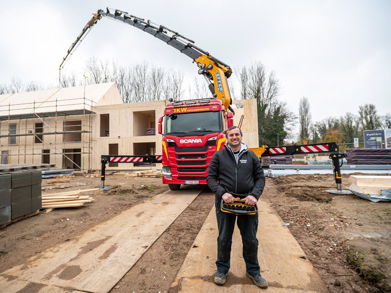 Industriebouw, woningbouw met vaak CLT-constructies, en af en toe het helpen aanplanten van volwassen bomen met een kraanwagen, dat is het goedgevulde orderboek van Johnny Kempenaers van JKW. “Soms zijn het zware ladingen die opgetild moeten worden en soms lichtere, maar dan wel over grotere afstanden. Tot nu toe werkte ik met een gewone vrachtwagen die een 30 ton-meter kraan trok, en dat beperkte wel eens de opdrachten die ik kon aannemen.” Om daarmee komaf te maken, investeerde JKW in een Scania 540S B8x4 met EFFER 1405-9S kraan. “Die heeft een capaciteit van 140 ton-meter en kan ladingen tot 40 meter ver brengen. Ideaal om ladingen over gebouwen te tillen,” aldus Kempenaers.