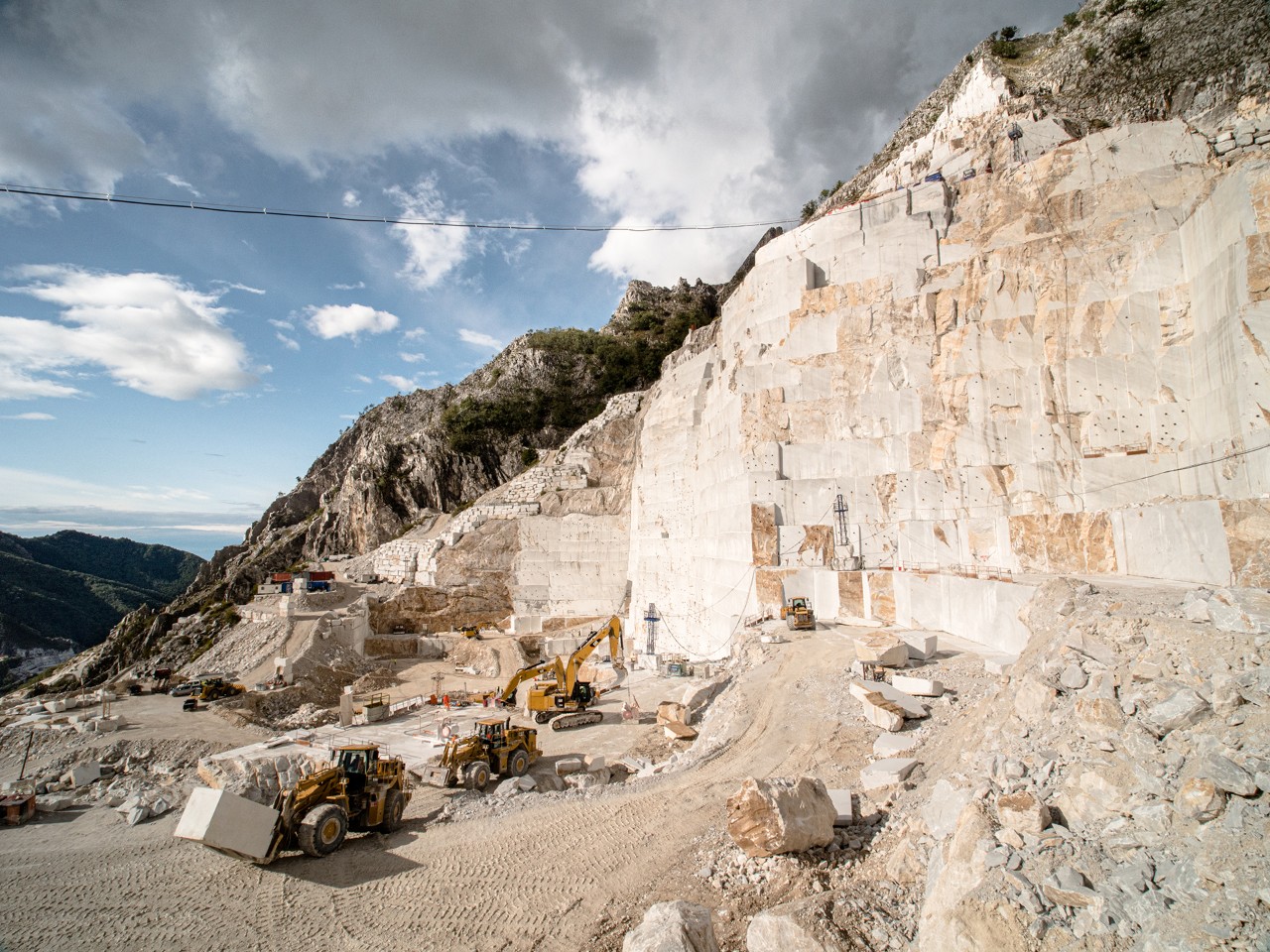Heute, als Andrea am späten Vormittag im Steinbruch ankommt, strahlt die Sonne über den Berg und fällt auf den weissen Marmorboden der Grube. Die Felswand, die fast senkrecht zum Grat aufsteigt, erscheint im Schatten des Berges ganz blau. An ihrem Fusse beugen sich zwei Arbeiter in gelben Jacken und Helmen über eine Schneidemaschine, deren Zähne sich langsam aber stetig tiefer in den Berg graben und rechteckige Steinblöcke herausschneiden.