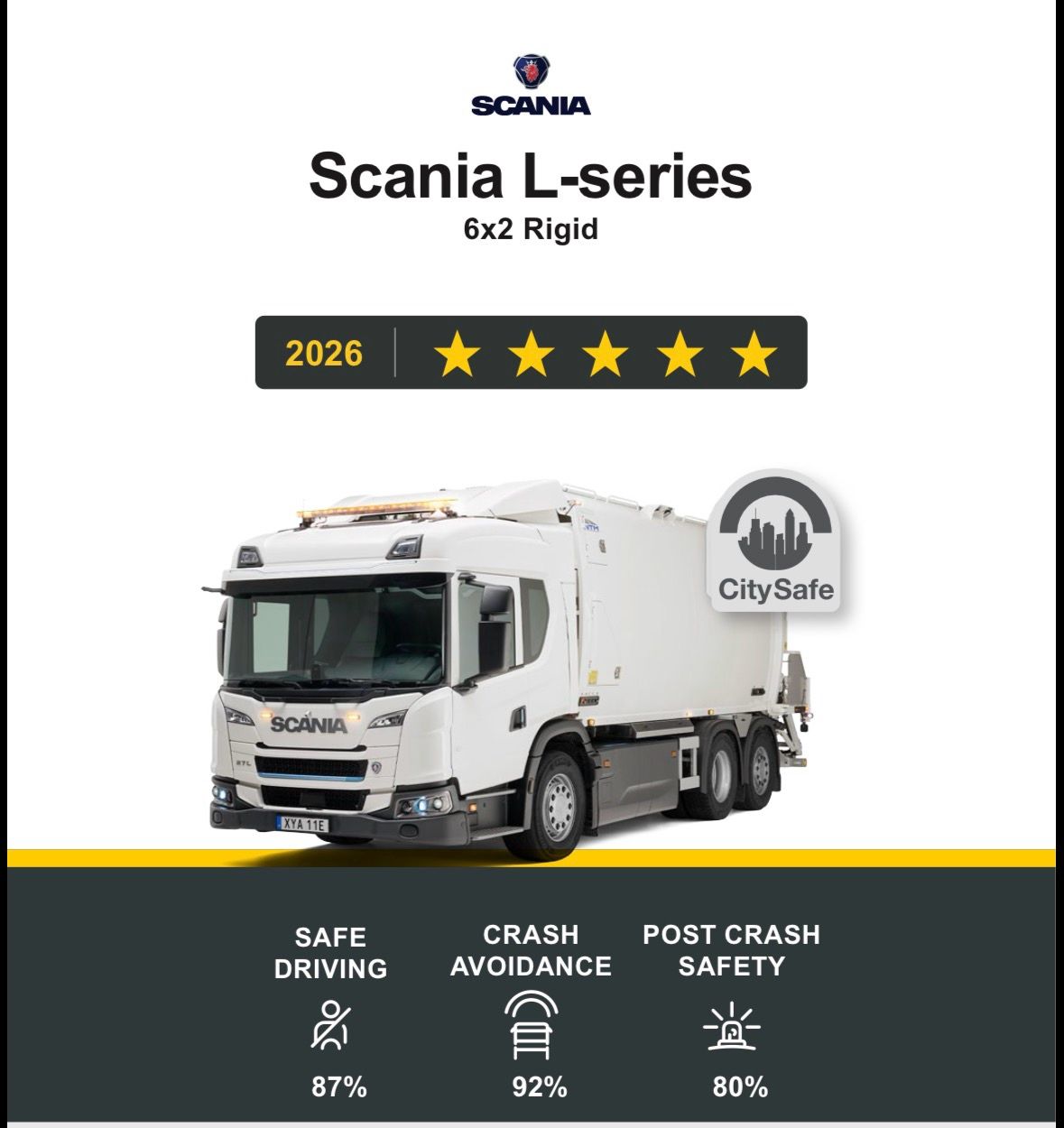 Die passive Sicherheit ist ebenso hoch, mit Fahrer- und Seitenairbags für zusätzlichen Schutz. Die robuste Struktur der Kabine erfüllt die höchsten Ansprüche von Scania an die Sicherheit der Insassen.