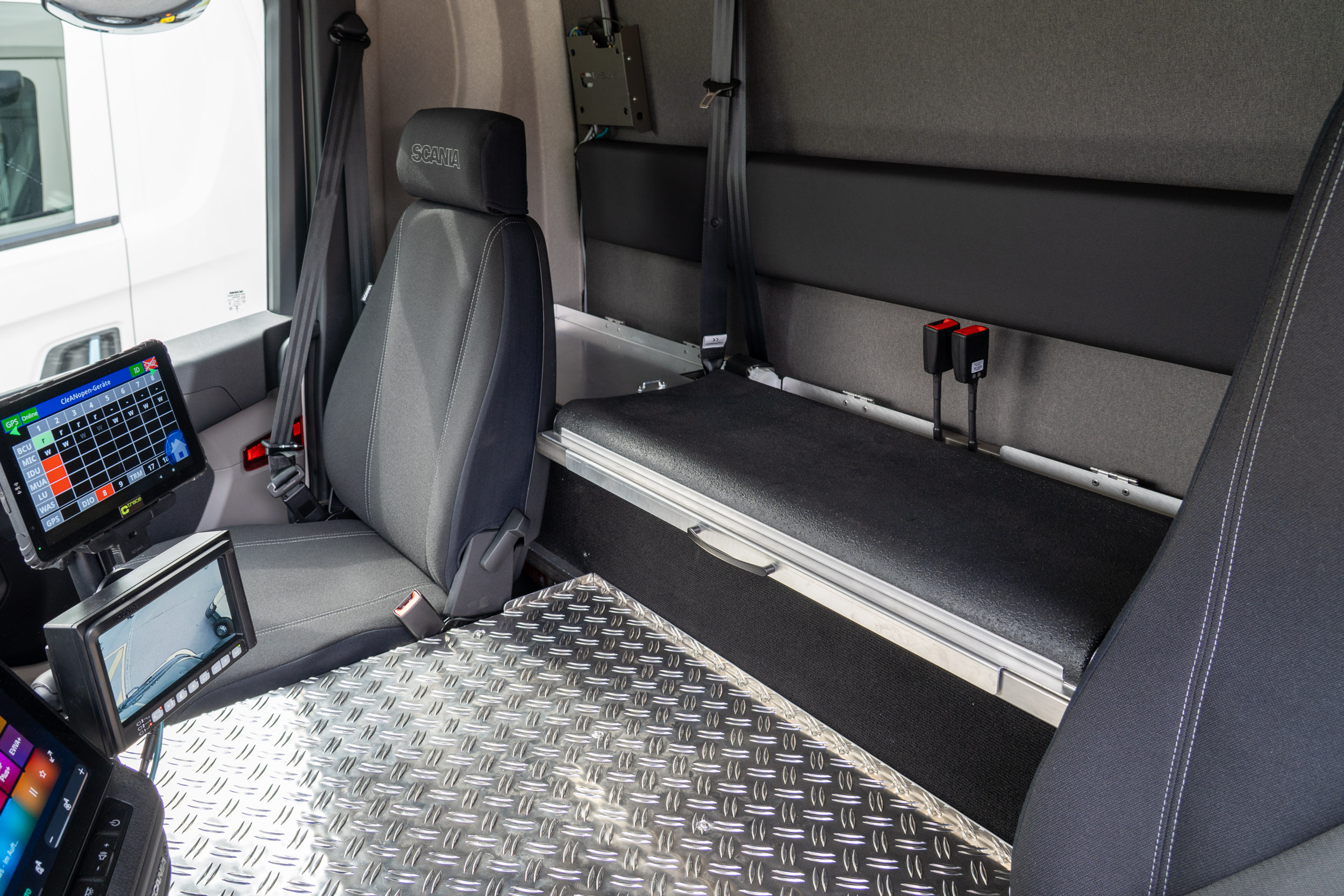Ein weiterer Pluspunkt ist die Kabine des Typs CG17N mit integrierter Sitzbank. Diese bietet Platz für zwei zusätzliche Personen, sodass insgesamt bis zu vier Personen in der Fahrerkabine mitfahren können. Das schafft zusätzliche Flexibilität im Arbeitsalltag, etwa für Ausbildungssituationen oder wechselnde Teamkonstellationen. Gleichzeitig profitieren die Mitarbeitenden von mehr Stauraum und einem erhöhten Komfort.