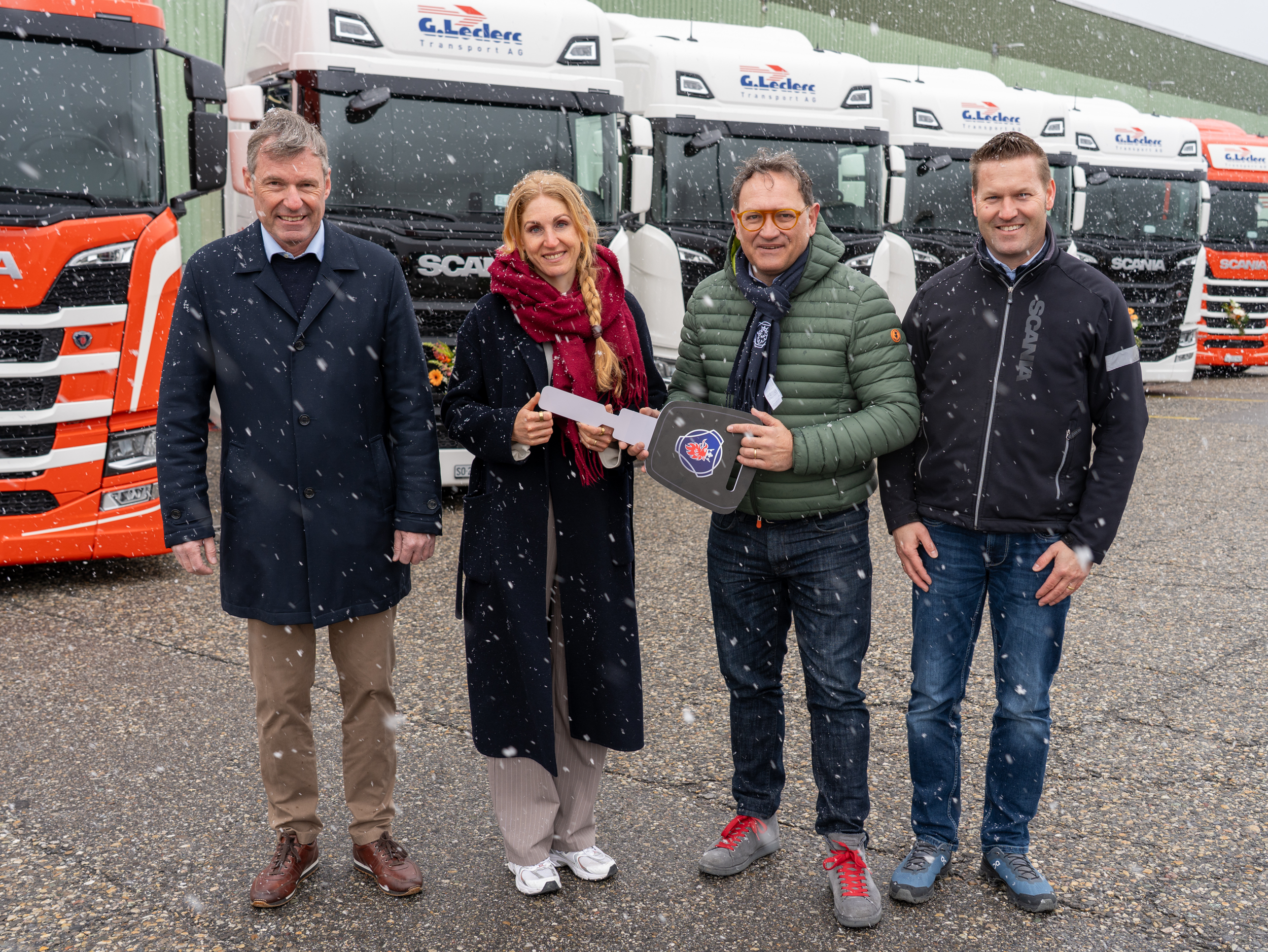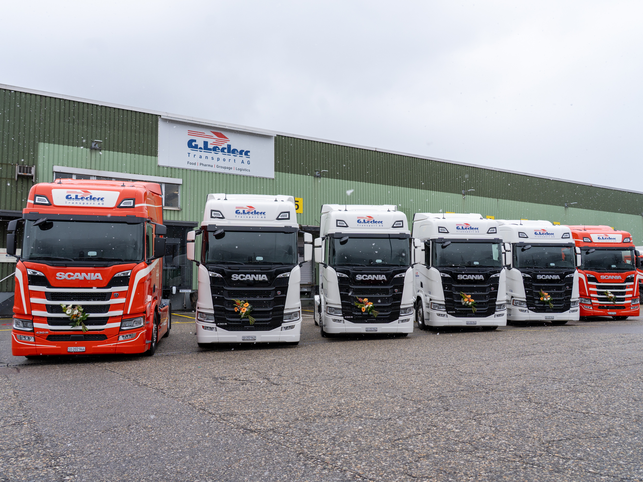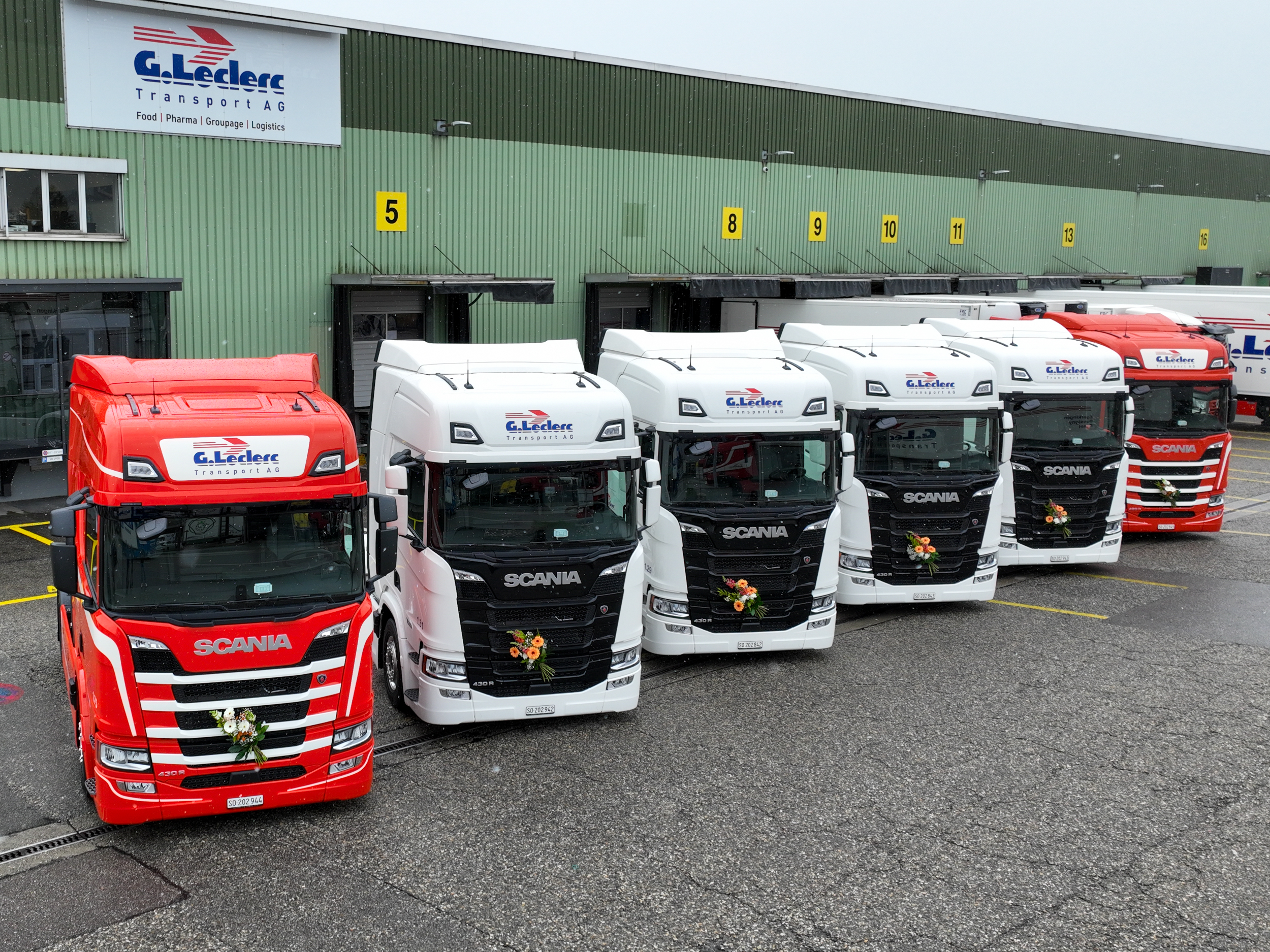 Mit der Übergabe von sechs identischen Scania Sattelzugmaschinen des Typs 430 R A4x2 baut die G. Leclerc Transport AG ihren Fuhrpark weiter gezielt aus. Die Fahrzeuge wurden im Rahmen einer offiziellen Übergabe durch Vertreter von Scania Schweiz AG an das Familienunternehmen aus Egerkingen übergeben.
