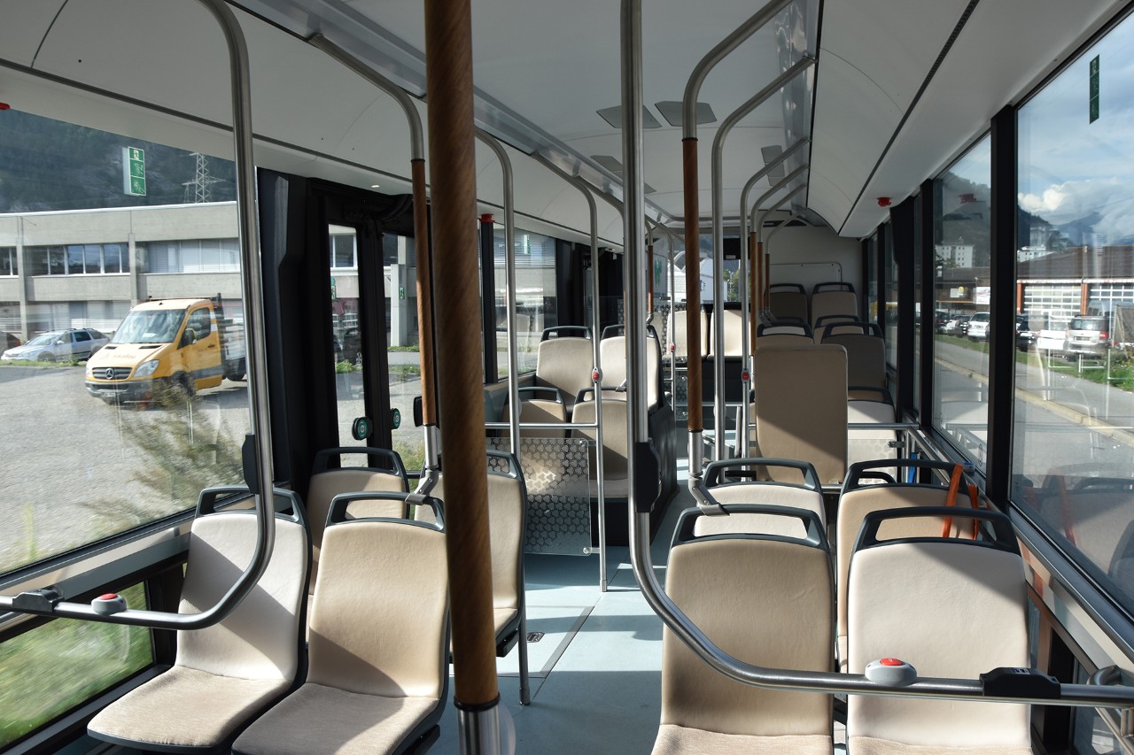 Notre véhicule d’essai de 12 mètres de long avec un empattement de 5,80 mètres contient environ 35 places assises et présente une charge utile de 6,5 t. Une rampe et une fonction d’abaissement permettent un accès facile aux chaises roulantes et aux poussettes. Grâce aux vitres supplémentaires en dessous des fenêtres latérales, le bus électrique paraît lumineux et accueillant et offre ainsi lors encore plus de confort aux passagers. Notre véhicule d’essai est équipé de coussins de siège et de poignées en bois. Le plancher clair souligne l’ambiance accueillante du bus.