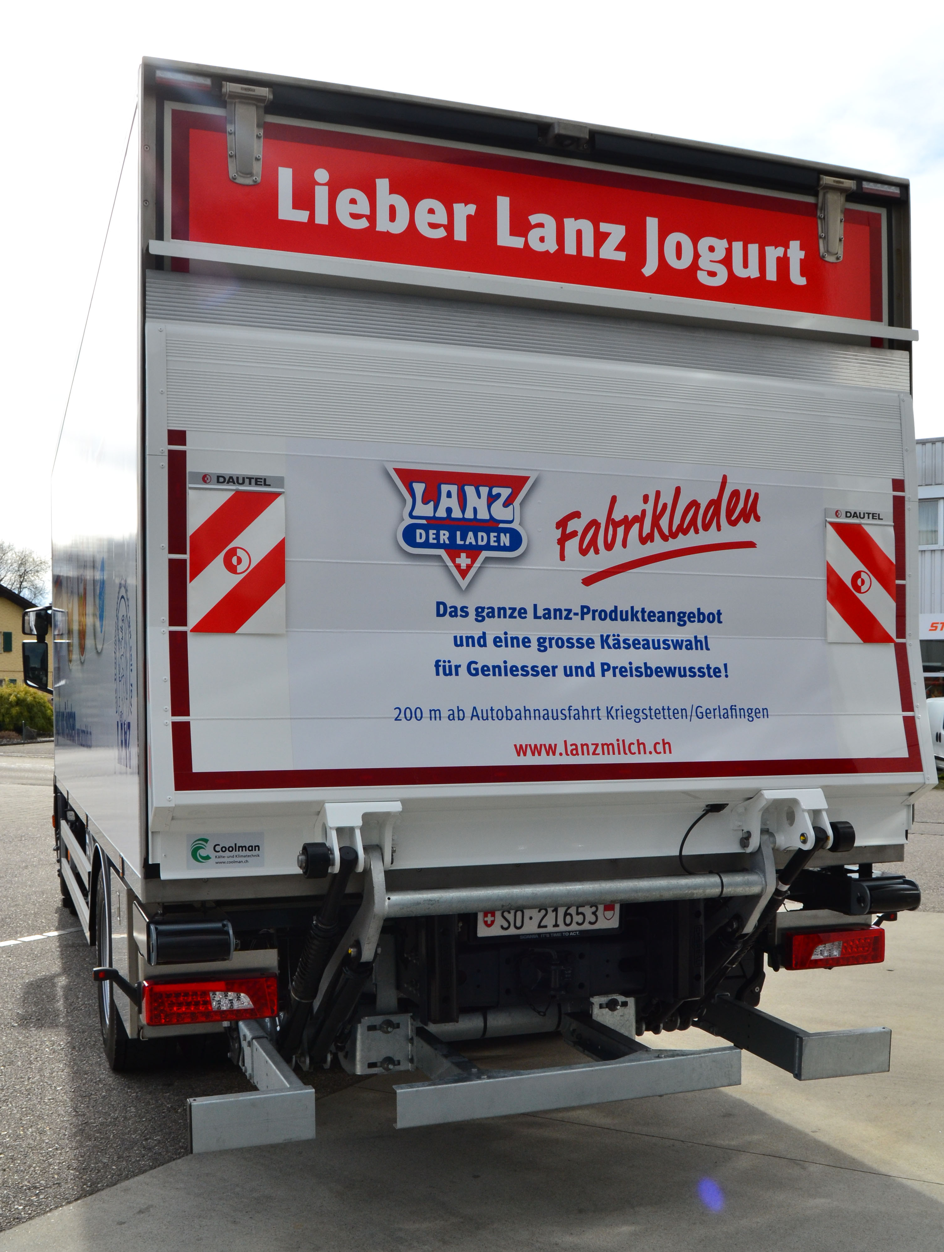Pour la carrosserie, Calag Carrosserie Langenthal AG a opté pour une structure autoportante entièrement en plastique, de type sandwich. Un plancher en aluminium PIEK avec une protection antichoc en aluminium ainsi que des profilés de finition en aluminium offrent une base sûre pour le montage des différents éléments composés de deux couches de couverture en plastique renforcé de fibres de verre (PRV), qui sont ainsi reliés sans rivets ni ponts thermiques. Une porte latérale à un vantail a été réalisée à l'arrière du côté droit de la carrosserie pour charger et décharger de petites quantités de produits, ou même une palette. À l'arrière du véhicule, une plateforme élévatrice DAUTEL DL-1500-48 S permet un (dé-)chargement rapide et sûr des marchandises. L'entreprise Coolman AG de Lengnau a installé un appareil de refroidissement sur le côté du châssis, de sorte que la hauteur du véhicule soit réduit à un minimum.