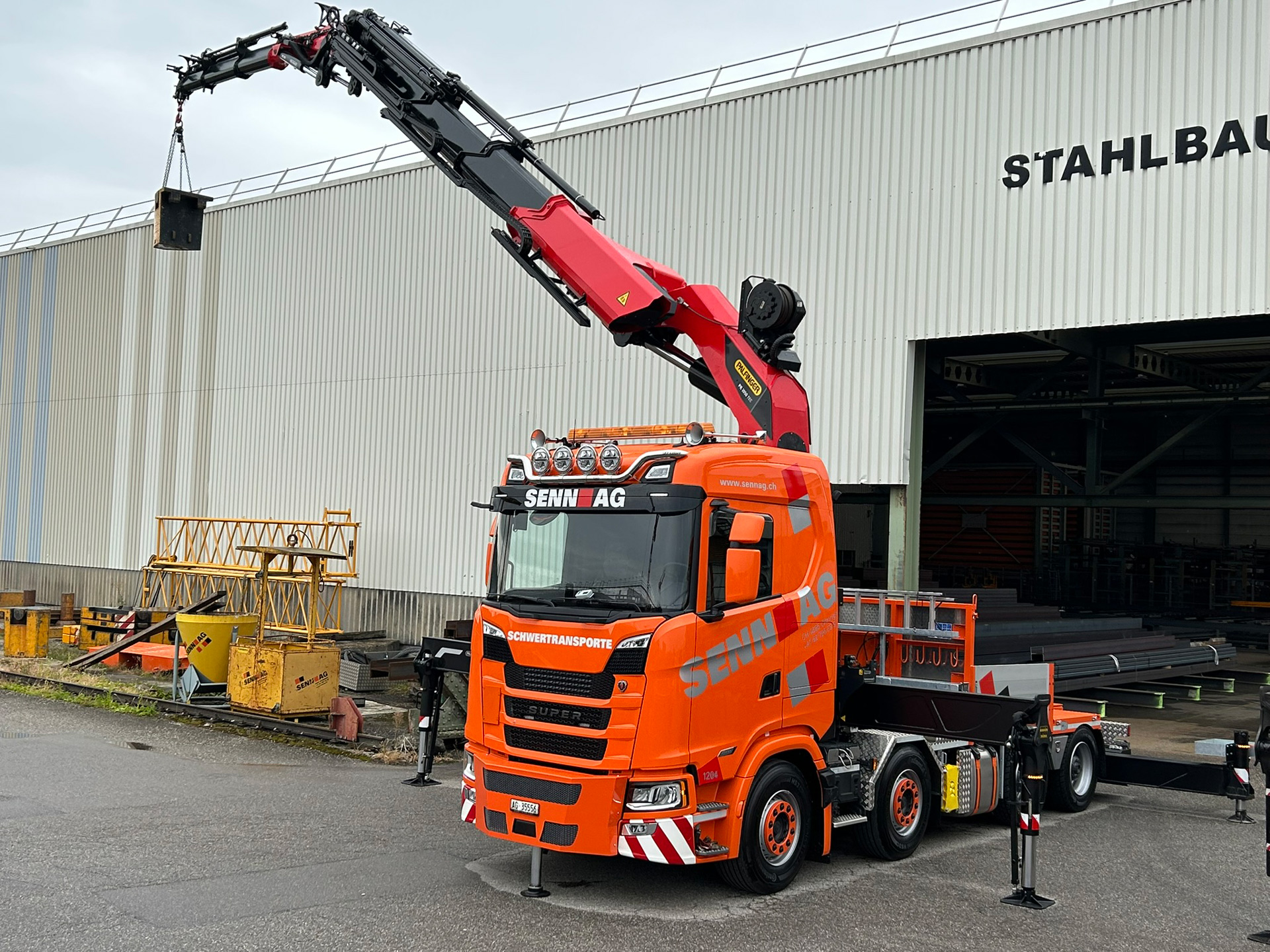La diversité des commandes des clients exige des concepts de travail et de transport adaptés, et c'est là que la configuration du nouveau camion-grue Scania joue ces atouts. Que ce soit en véhicule solo avec un pont de chargement de 5 m de long, avec une remorque ou comme tracteur à sellette avec différentes semi-remorques, Senn AG dispose d'une solution adaptée à chaque travail. La partie arrière du pont de chargement se démonte rapidement et facilement à l'aide de la grue, et le puissant camion-grue est prêt à relever de nouveaux défis en un rien de temps.
