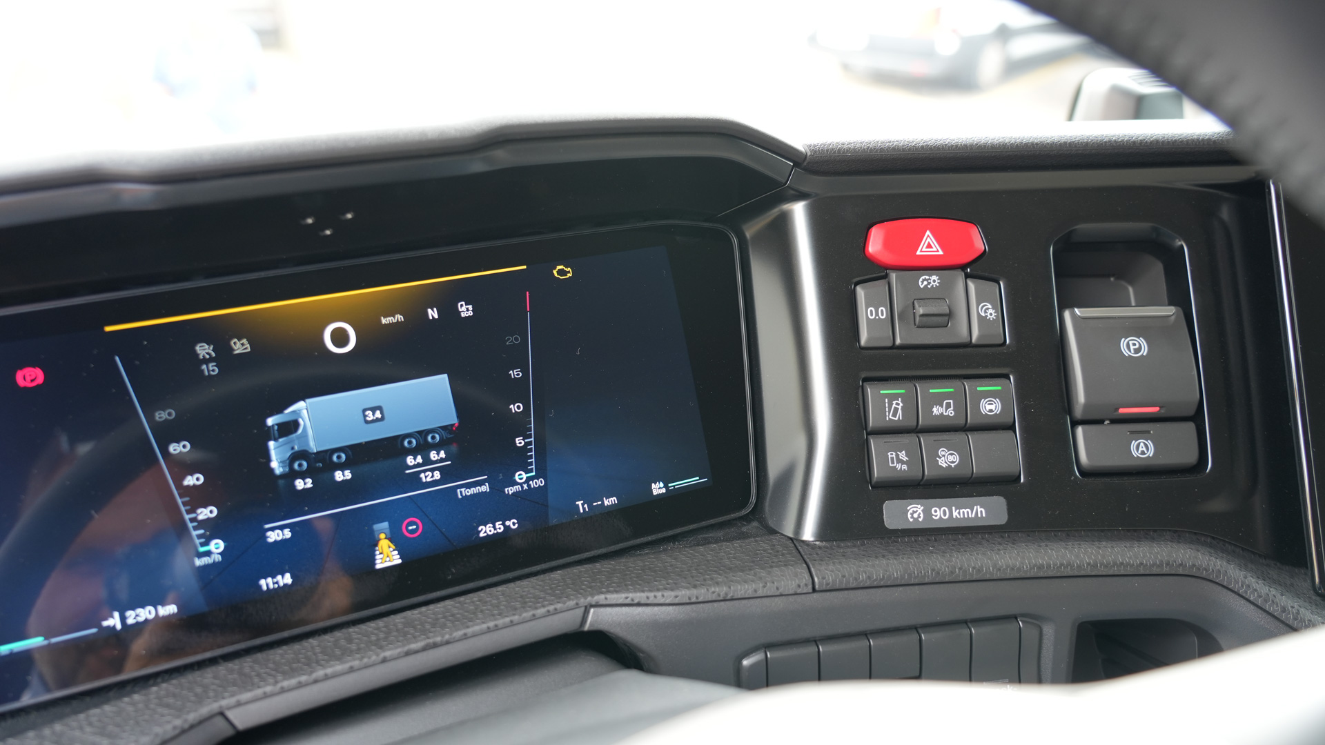 Le conducteur a opté pour une cabine CS20N sur le châssis à quatre essieux. Grâce à son plancher plat, elle lui offre une sensation d'espace optimale, améliorant ainsi son confort pendant les pauses. Installé sur le siège «royal», le conducteur bénéficie d'un poste de travail incomparable. Ergonomie optimale, grande facilité d'utilisation et excellente visibilité panoramique offrent un confort maximal, gage de sécurité sur route et sur chantier.