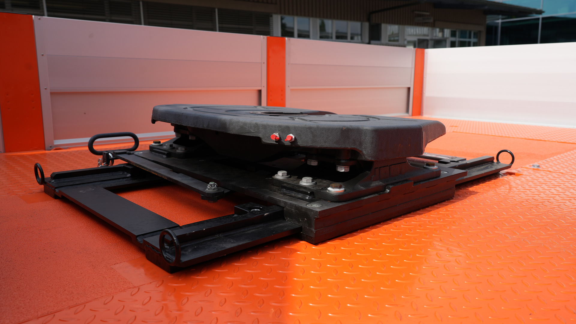 Un châssis 8x4 à suspension pneumatique complète constituait la base idéale pour ce nouveau véhicule-grue. L'un des principaux critères de choix d'un châssis Scania était la hauteur de pont maximale requise de 108 cm. Ce critère était crucial pour garantir que le véhicule puisse également transporter des conteneurs de construction classiques. Pour cela, un châssis à suspension pneumatique complète était une exigence essentielle, ainsi que d'autres caractéristiques spécifiques que le nouveau véhicule Scania remplissait également. Un autre aspect important était le double châssis disponible en usine, qui, d'une part, permet l'installation d'un support avant de 25 tonnes et, d'autre part, garantit la stabilité nécessaire lors des opérations de grutage grâce au système de stabilisation 5 points intégré. Une charge sur l'essieu avant de 10 tonnes assure également une sécurité optimale, un atout majeur pour un poids total de l'ensemble maximal de 80 tonnes.