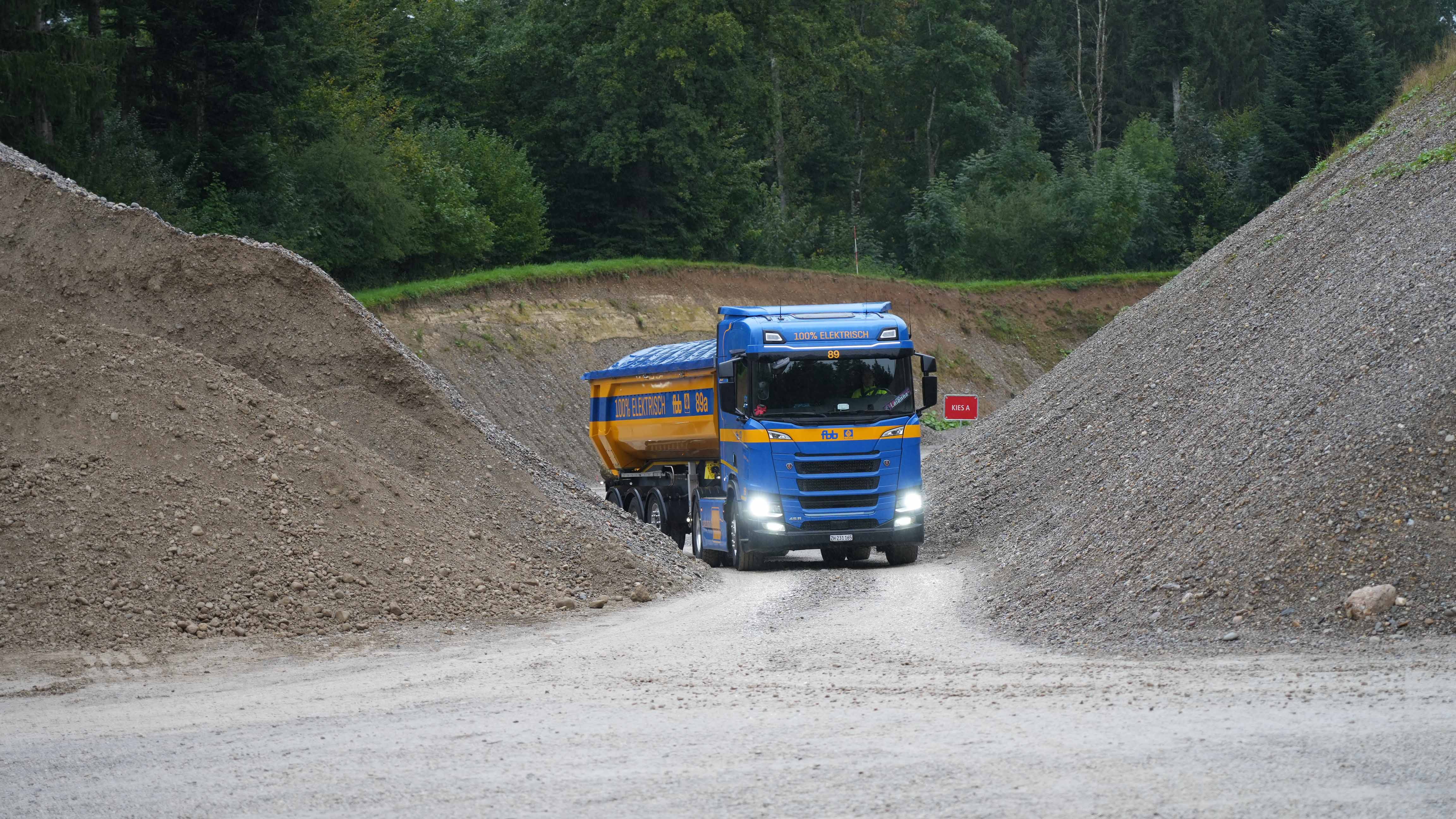 Au début, une certaine réticence était perceptible au sein de l'entreprise concernant l'utilisation des deux Scania BEV. Mais à chaque nouvelle utilisation, on a pris confiance dans le nouveau véhicule, avec sa propulsion entièrement électrique, son empattement légèrement plus long et son poids à vide plus élevé. Aujourd'hui, les deux tracteurs routiers sont utilisés pour le transport de composants, d'asphalte routier démonté, d'asphalte frais, de gravier concassé ou encore de matériaux d'excavation normaux. Principalement dans la région de l'Oberland zurichois ou avec des résidus d'asphalte vers Bâle, dans le port rhénan. Il s'agit donc d'utilisations tout à fait « normales », simplement avec une propulsion entièrement électrique. Peu après les premières utilisations, il a été constaté avec satisfaction que les deux nouveaux véhicules pouvaient être utilisés de manière équivalente. Grâce à leur empattement légèrement plus long et à leur répartition optimale du poids, ils peuvent même être utilisés dans les gravières, car leur centre de gravité bas et leur poids à vide plus élevé leur confèrent une traction optimale.