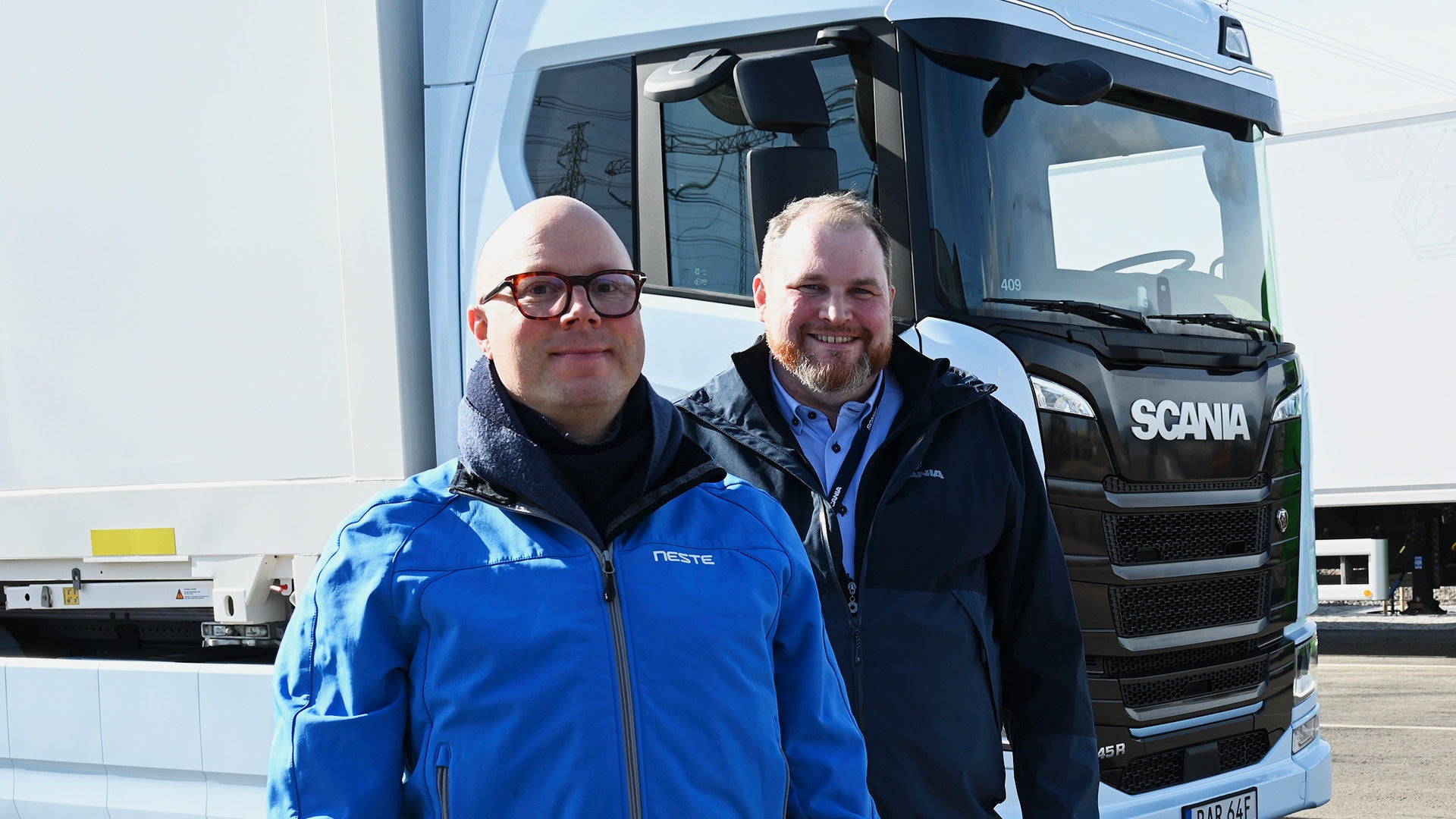 Antti Pulkkanen (edessä) ja Michael Mannfors kertovat Nesteen ja Scanian yhteistyöllä olevan pitkät perinteet.