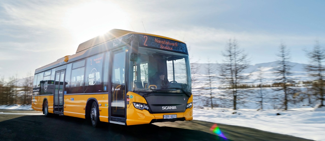 The bright yellow Scania Citywide gas buses in the Arctic city of Akureyri are a visible manifestation of this northern Icelandic city’s commitment to sustainability.