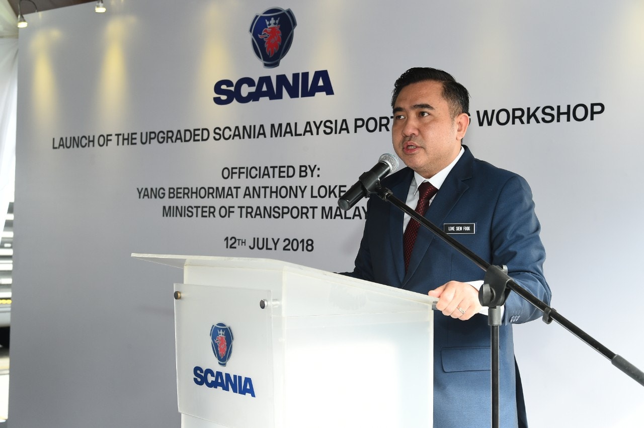 Minister of Transport, YB Anthony Loke speaking at the launch of Scania Malaysia’s upgraded Port Klang branch that will serve to strengthen sales and services for its customers within the region.