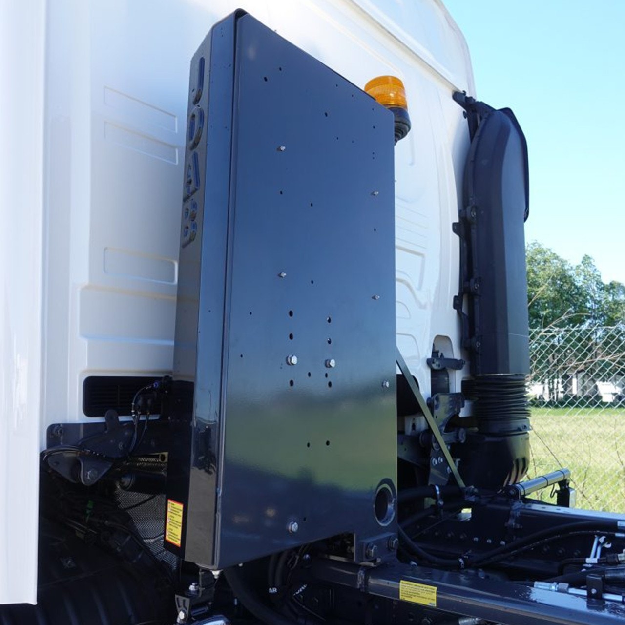 Kan ikke kombineres med høyt luftinntak, og/eller eksosutløp over tak. I disse tilfellene monteres hydraulikktanken på ramme (bilde), og verktøykasse utgår.