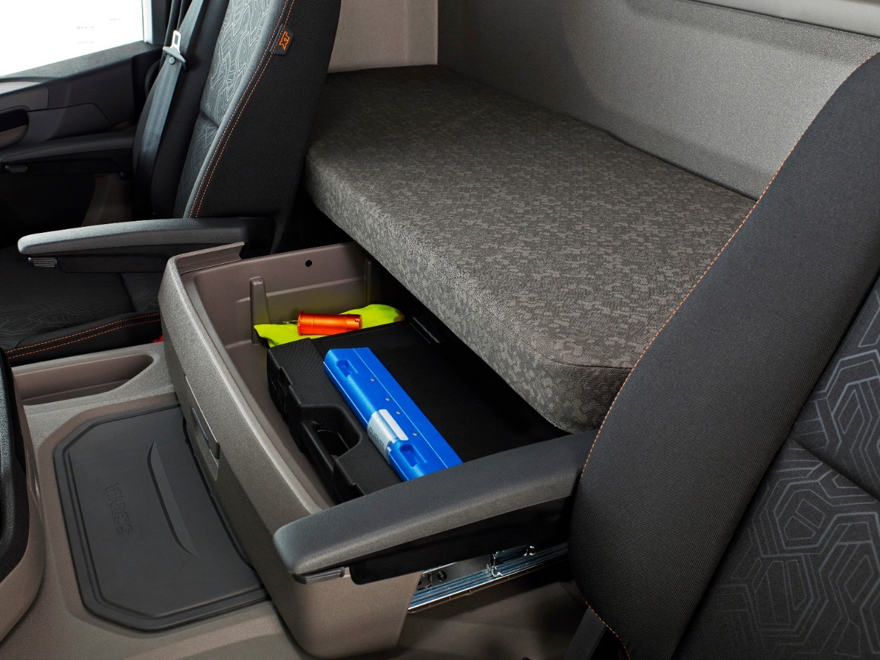 Espacio de almacenamiento considerable en la parte delantera del nuevo techo normal para la cabina diurna, que cuenta con mucho espacio para guardar cascos, guantes y otras pertenencias.